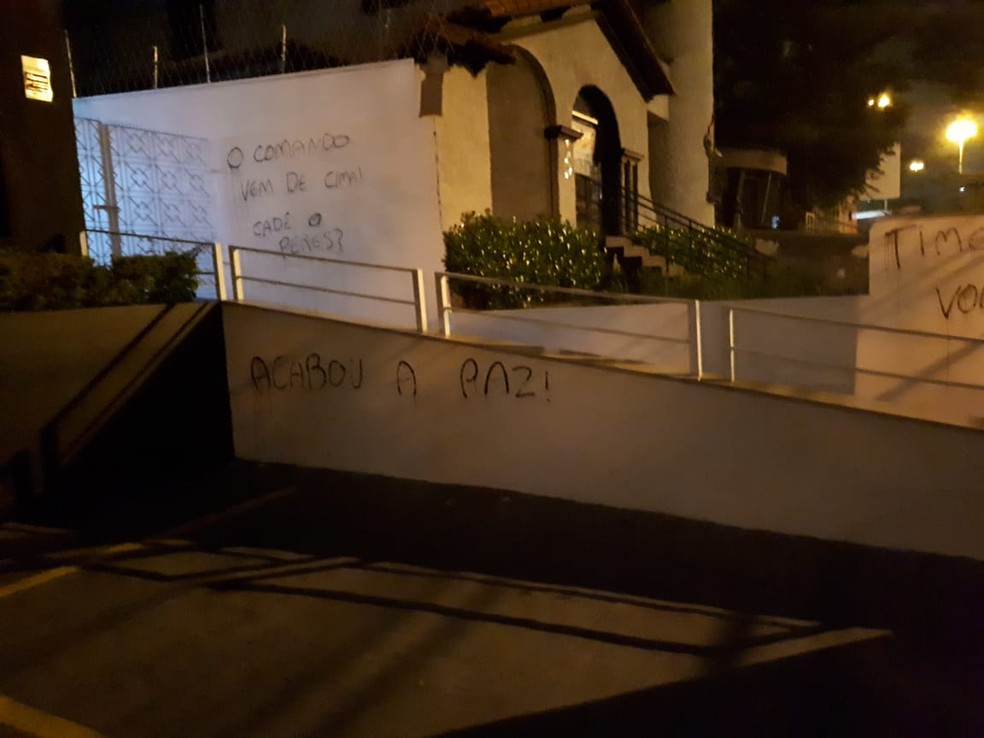 "Acabou a paz", "O comando vem de cima. Cadê o Peres?" e "Time sem vontade" são as frases pichadas. Veja na imagem abaixo: