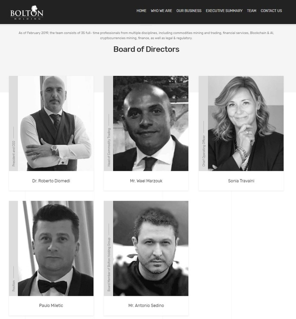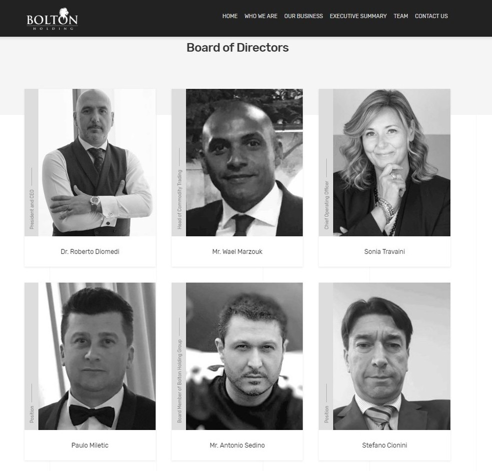 Reprodução do site da Bolton que, até a semana passada, apresentava Cionini (abaixo, à direita) entre os diretores — Foto: Reprodução