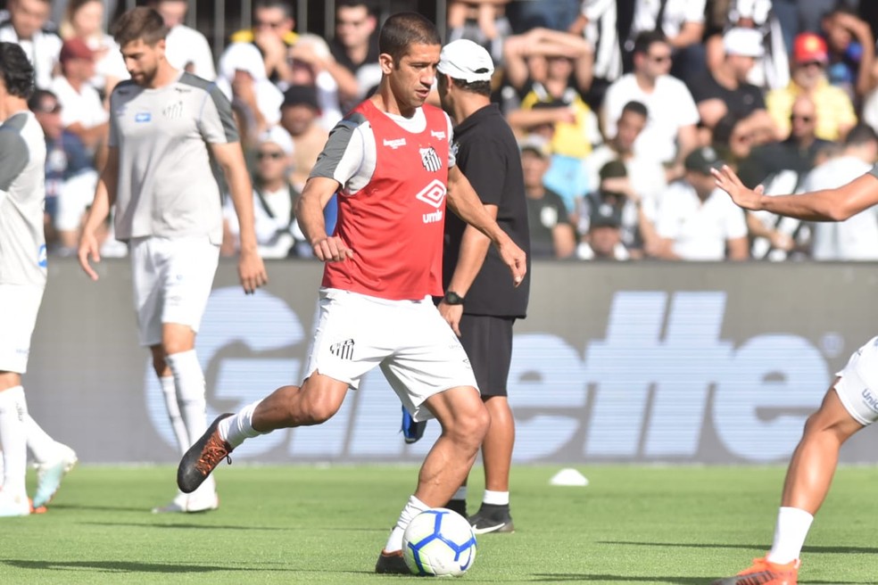 Evandro no aquecimento antes de Santos x Fortaleza; meia foi titular e agradou a Sampaoli Foto: Ivan Storti/Santos FC
